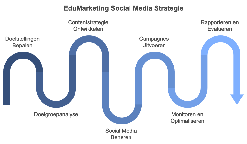 Bij EduMarketing hanteren we een doordachte en gestructureerde aanpak voor social media marketing, gericht op het behalen van meetbare resultaten voor onderwijsinstellingen en opleiders. Onze strategie bestaat uit de volgende stappen.